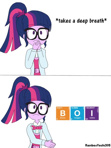 1138701 Safe Artist Rainbowyoshi305 Derpibooru Import Sci Twi Twilight Sparkle Equestria Girls C Boi Boron Bowtie Breathing Clothes Dialogue Frown Glasses Iodine Lab Coat Meme Oxygen Periodic Table Simple Background Solo Twibooru